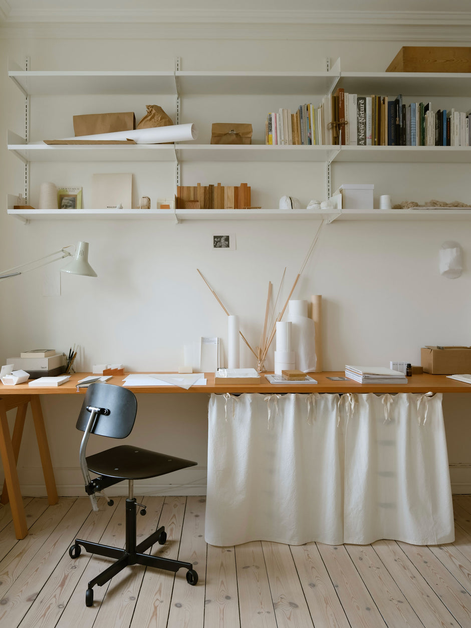 Visiting architect Marie Jagd and her family north of Copenhagen. In the spacious light filled living rooms you will find a big library of materials, textures, packaging, and small art pieces.